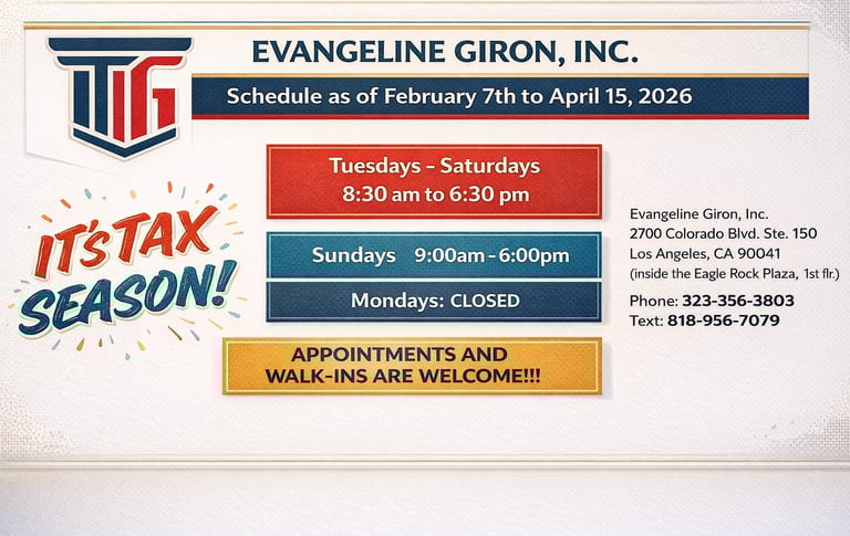 Evangeline Giron, Inc. is not just a tax preparation company; we are a dedicated firm that prioritizes the financial well-being and prosperity of those we serve. Our services extend beyond the mere preparation of tax returns - we aim to ensure that our clients are fully informed and engaged in every aspect of their financial obligations.