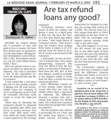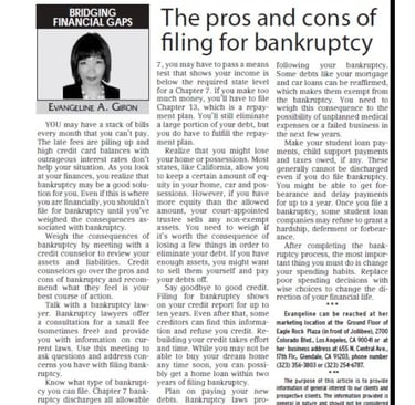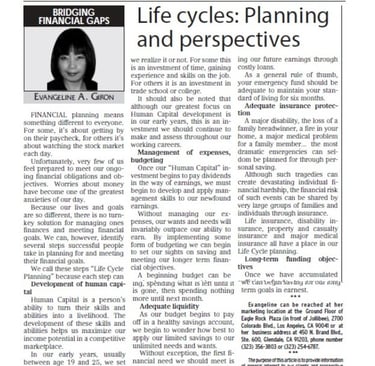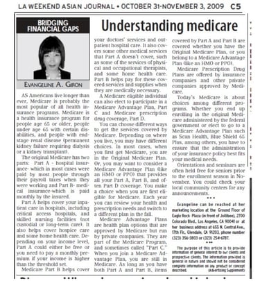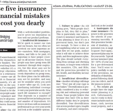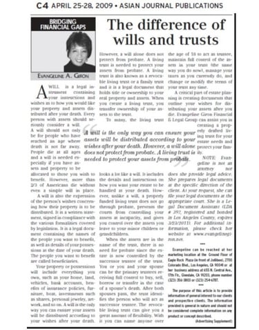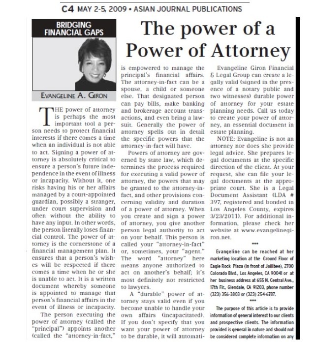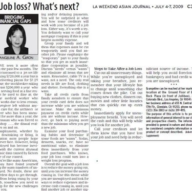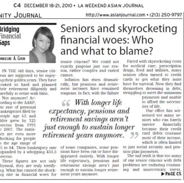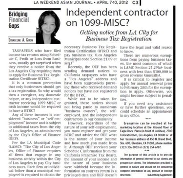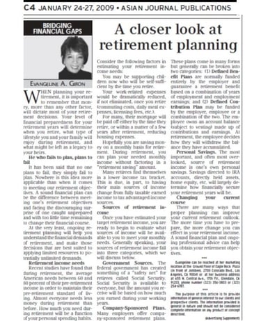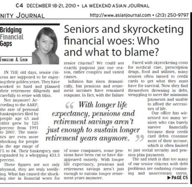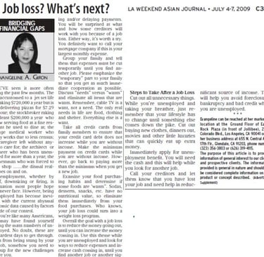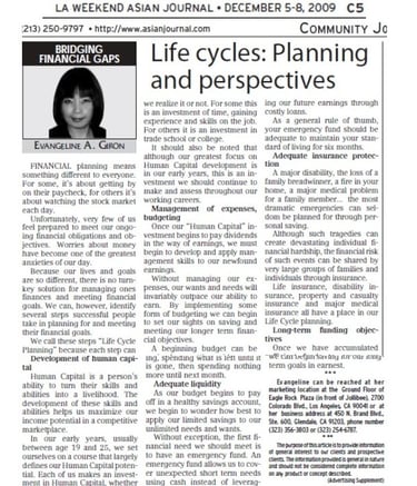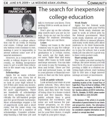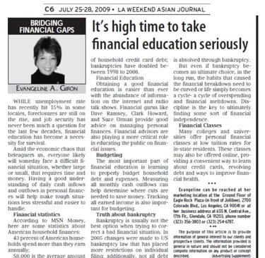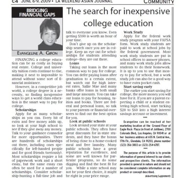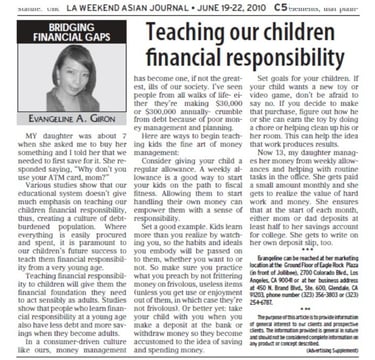 Evangeline authored a weekly column titled “Bridging Financial Gaps” for four years at the Los Angeles Asian Journal, the largest Filipino-American newspaper in the United States, from 2008 to 2012.