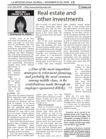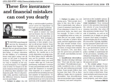 Evangeline authored a weekly column titled “Bridging Financial Gaps” for four years at the Los Angeles Asian Journal, the largest Filipino-American newspaper in the United States, from 2008 to 2012.